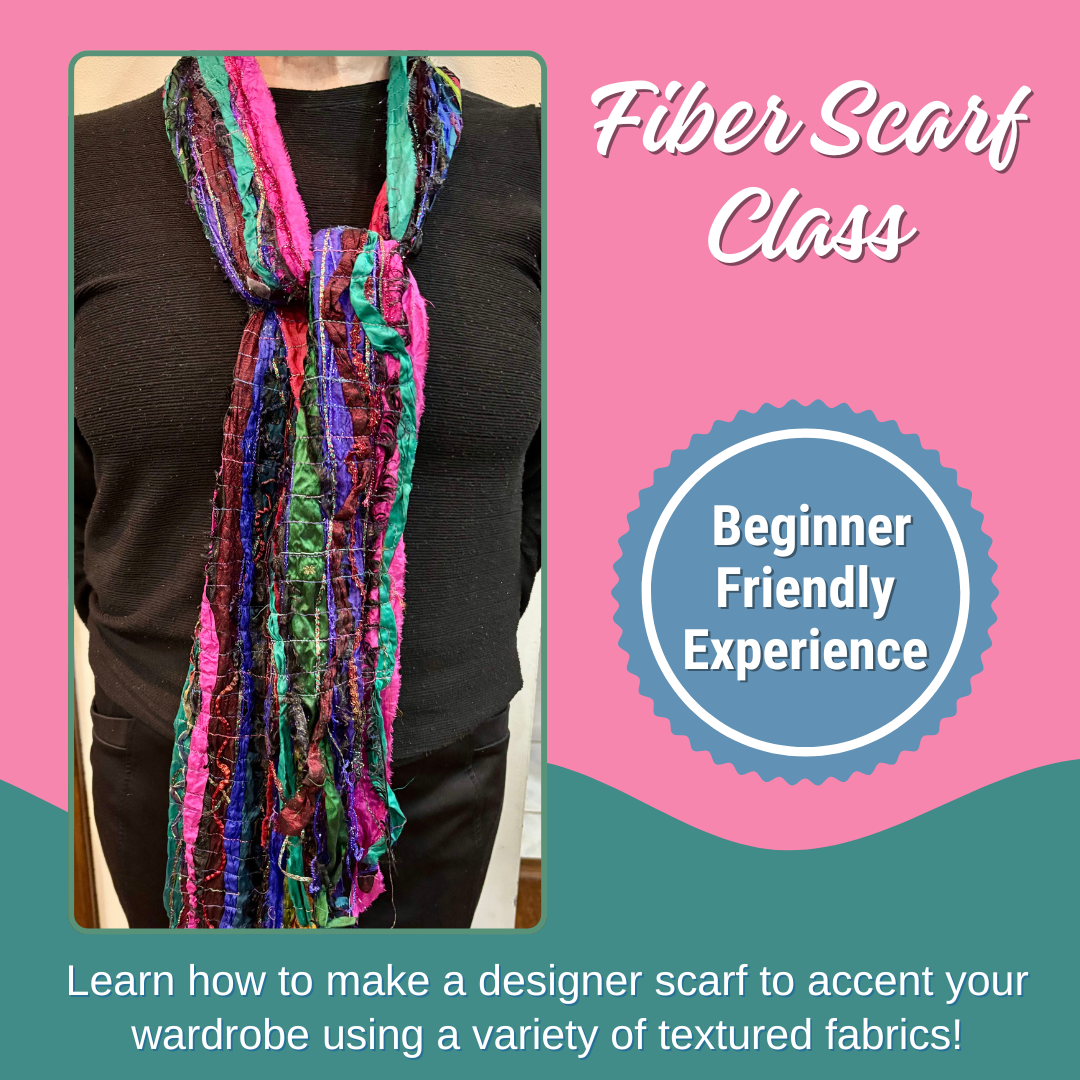 There are wonderful fibers with a variety of textures; metallic, stubby, matte, fuzzy, shiny. We will use all of them to make a designer scarf to accent your wardrobe. It's fun and easy to do with a little free motion work! All materials included in class fee. Class is on Friday, Feb. 20th, 10:30 am - 12:30 pm